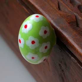 Indian decorative door knob, ceramic and metal, white and green colors, oval shape. Hand-painted, with stand and thread. Handcrafted Indian item, for door or drawer handle, Indian furniture decoration.