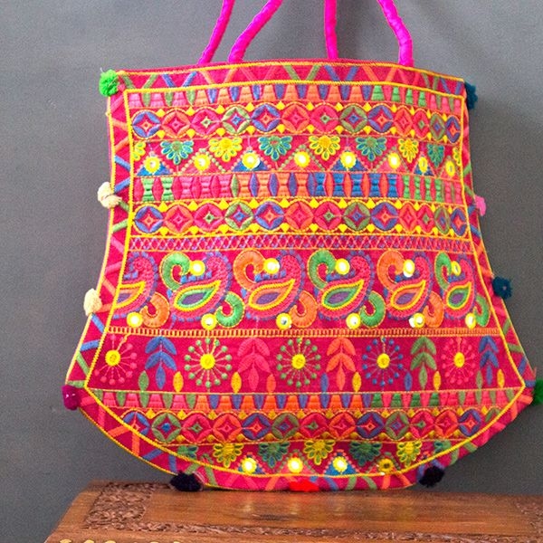 Very fashion. Finely embroidered handbag with zip and 1 inside pocket. Pink color, great size. Fashion accessory in India. Bag for Indian women, colored and decorated, Indian fashion item.