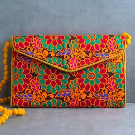 Very fashion. Finely embroidered small handbag with a shoulder straps. Fashion accessory in India. Indian bag for women, colorful and decorated cotton, Indian fashion item.