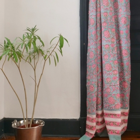 Indian printed cotton curtain. Made in India, handprinted with wooden blocks. Cyan, pink and green colors with beautiful traditional Indian flower patterns. Very nice Indian decoration for the house. Curtain for door, patio door or window, with metal rings.