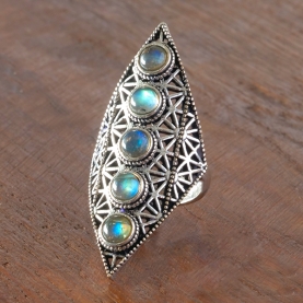 Bague indienne look ethnique avec taille réglable. Bijou indien en métal argenté joliment travaillé, design traditionnel. Bague avec imitations pierres de lune, idéale pour donner une belle touche indienne à votre look.